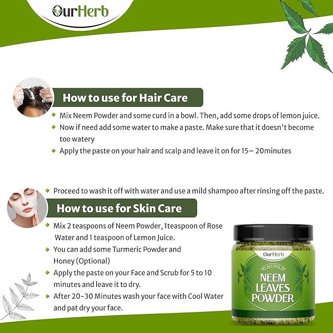 - ✅ 𝐏𝐮𝐫𝐞: OurHerb Neem Leaves Powder (Azardirachta Indica) is 100% natural, made using handpicked ingredients. It can be used on hair and face.